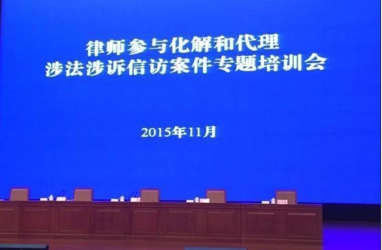 2015年11月10日至11日,律师参与化解和代理涉法涉诉信访案件专题培训会在山东省济南市召开。最高法院、最高检察院、公安部信访部门主要负责同志,各省级党委政法委、法院、检察院、公安厅局、司法厅局及律师协会分管负责同志及部分律师、法律专家学者参加会议。中央政法委副秘书长王其江在会上作辅导报告,司法部副部长赵大程出席会议并讲话,中央政法委有关同志解读了《律师参与化解和代理涉法涉诉信访案件制度的意见(试行)》,最高法院、最高检察院、公安部信访部门主要负责同志就本系统落实律师参与化解和代理涉法涉诉信访案件工作、深入推进涉法涉诉信访改革作了发言。 会议提出,在今年底前,各地要拿出建立律师参与化解和代理涉法涉诉信访案件制度具体实施意见,鼓励有条件的地方先行启动;省一级在明年上半年、地市一级在明年底前都要推开实施;县区一级根据各地实际做出安排。