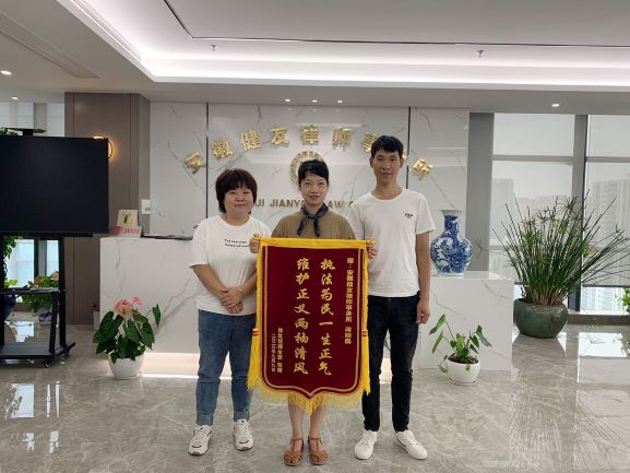 2020年9月10日,当事人弥博宇的家人来到安徽健友律师事务所,将一面写有“执法为民一生正气,维护正义两袖清风”的锦旗送到了蒋晓磊律师的手上,向安徽健友律师事务所及蒋晓磊律师表达了真诚的谢意,感谢蒋律师的专业和负责。蒋晓磊律师接受了锦旗并与客户合影。