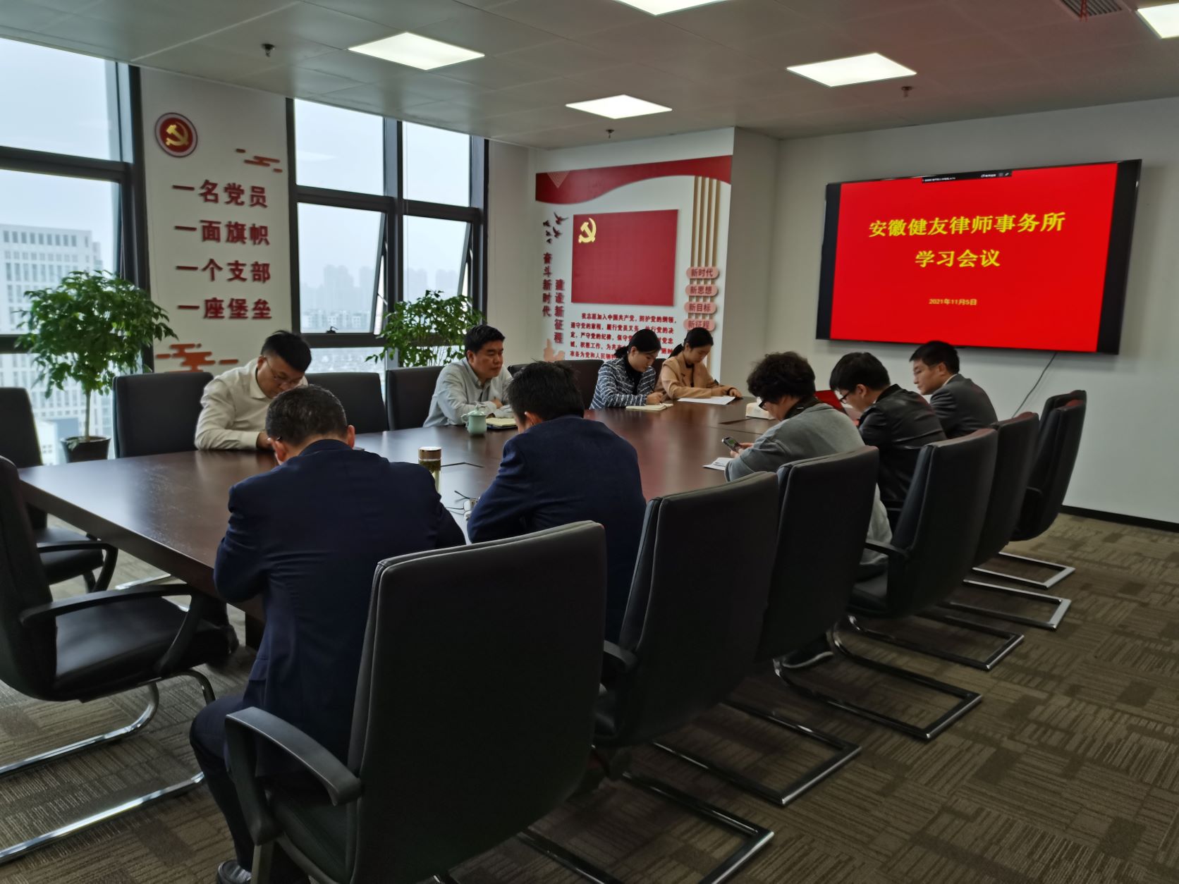 2021年11月5日下午,安徽健友律师事务所召开专题会议,传达学习第十次全国律师代表大会精神,全体在所律师、工作人员参会,会议由律所支部书记金瑞律师主持。