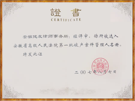 一、本所被选入安徽省高级人民法院第一批破产案件管理人名册