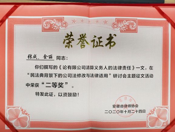 喜讯:我所张成律师、金丽律师论文荣获“民法典背景下的公司法修改与法律适用”研讨会主题征文活动二等奖