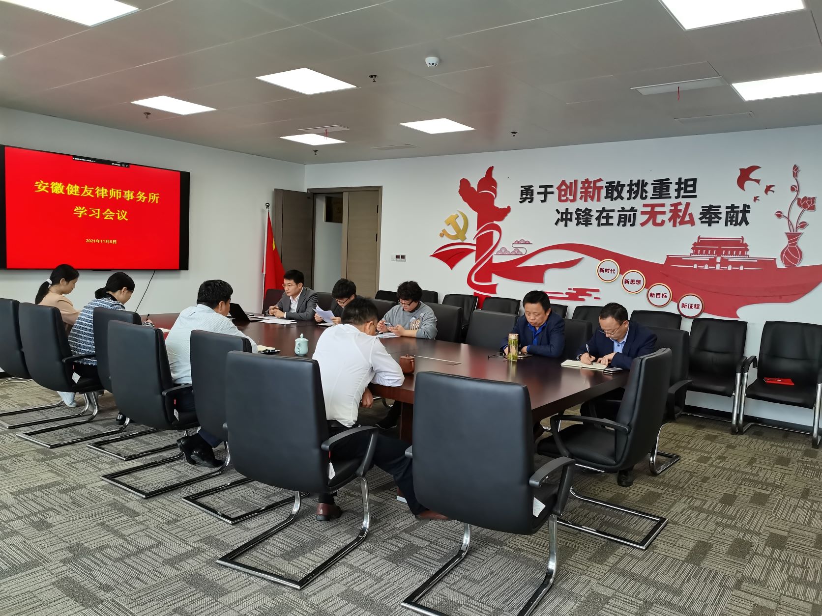 2021年11月5日下午,安徽健友律师事务所召开专题会议,传达学习第十次全国律师代表大会精神,全体在所律师、工作人员参会,会议由律所支部书记金瑞律师主持。